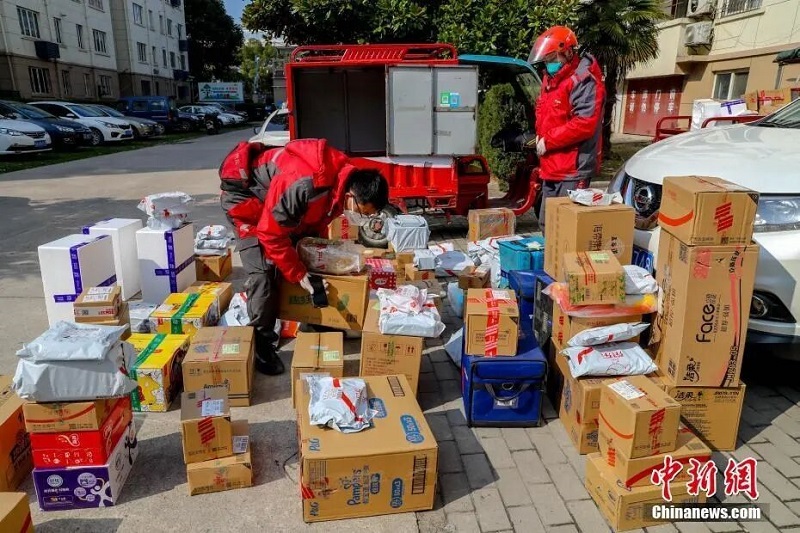 武漢漢口常青花園社區(qū),快遞員卸下快件等待客戶(hù)前來(lái)取件。中新社記者 張暢 攝